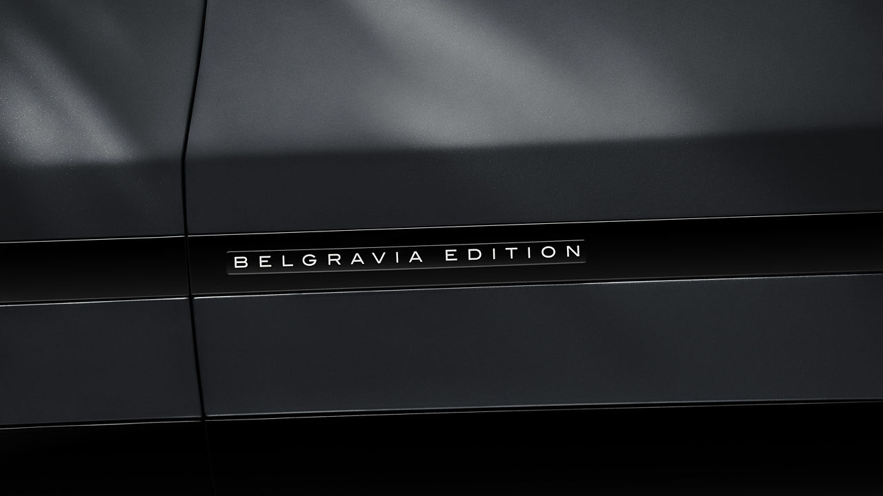 Odważny i nowoczesny wygląd zewnętrzny podkreślają 20-calowe obręcze Diamond Turned w kolorze Dark Agate z lakierem Satin Black Tinted. Sygnatura „Belgravia Edition” pojawia się w sposób płynny i dyskretny na dolnych listwach drzwi, czarnym szczotkowanym wykończeniu aluminiowym oraz w unikalnych projektorach świetlnych. Miękkie, szlachetne wykończenia ze skóry z precyzyjnym, kontrastowym przeszyciem tworzą dopracowaną, rzemieślniczą interpretację luksusu.